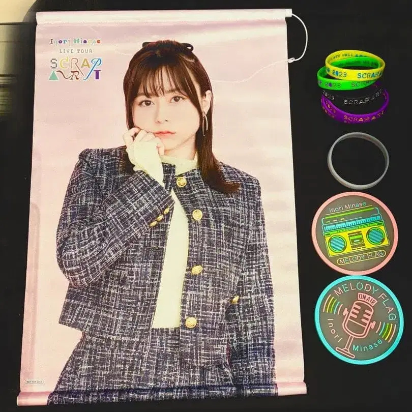 미나세 이노리 굿즈 세트 자택 보관 중이었으나 미니멀리스트를 위해 판매합니다. 큰 흠집은 보이지 않지만, 봉투에서 꺼낸 것도 있어 미세한 흠집이 있습니다. 양해 부탁드립니다. 러버 코스터는 사용했기 때문에 중고품입니다. SCRAP ART ▶ 구매 혜택 A3 태피스트리 러버 밴드 ▶ SCRAP ART x 6 ▶ glow x 1 [ 미나세 이노리 MELODY FLAG ] 공개 녹음 이벤트 ▶ 러버 코스터