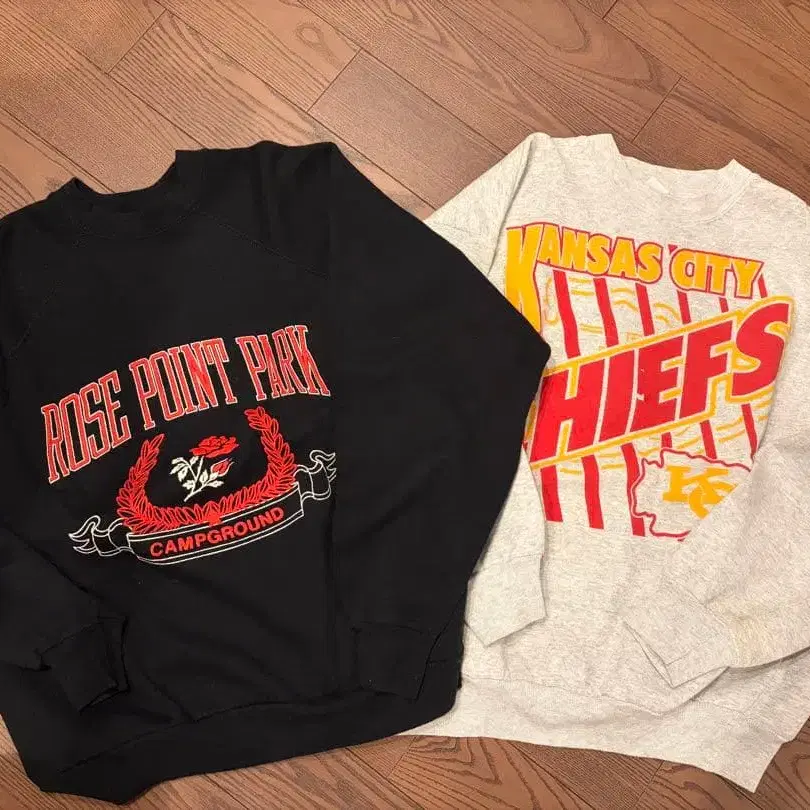 로즈 포인트 파크와 캔자스시티 치프스의 디자인이 특징인 맨투맨. - 디자인: 로즈 포인트 파크 캠핑 그라운드 그래픽 - 디자인: 캔자스시티 치프스 로고 - 색상: 블랙 - 색상: 그레이 방문해 주셔서 감사합니다. 사이즈 - S