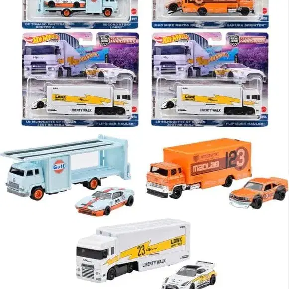 핫휠 팀 트랜스포트 세트 LBWK LB-실루엣 x 2 Galf 데토마소 판테라 MAD MIKE RX-3 4대 세트입니다. - 세트 내용: 핫휠 미니카 4대 - 모델명: FLF56 - 제조국: 태국 - 패키지 내용: 4피스 - 상태: 미개봉 - 색상: 오렌지, 화이트, 블루 방문해 주셔서 감사합니다. 종류 - 프리미엄카 스케일 - 1/64