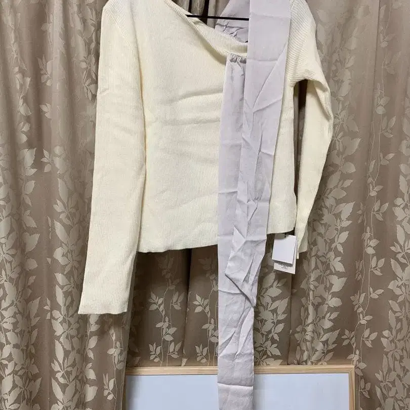 크림색 리브 니트 오프숄더 긴팔 상의, 리본 포함 디자인.
