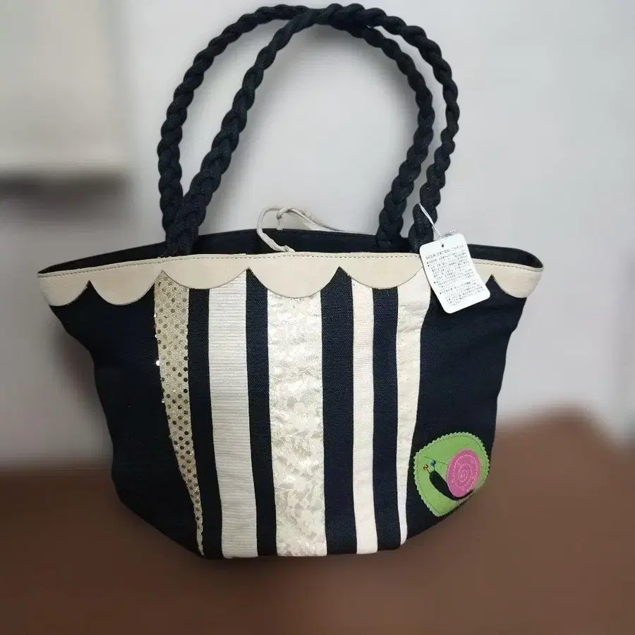 스트라이프 디자인의 컬러풀한 달팽이 자수가 놓인 토트백