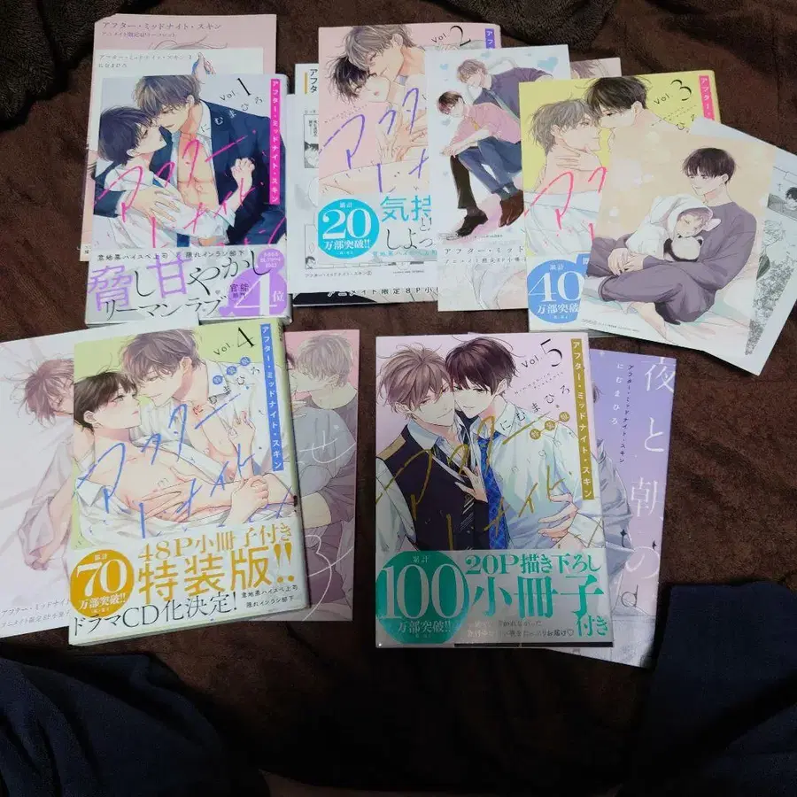 [ 애프터 미드나잇 스킨 ] 1권 ~ 5권 니무마히로 1권 애니메이트 리플렛 코미코미 스튜디오 리플렛 2권 애니메이트 소책자 페이퍼 3권 애니메이트 소책자 애니메이트 엽서 페이퍼 4권 특장판 소책자 애니메이트 소책자 애니메이트 엽서 5권 특장판 소책자 각종 혜택 포함입니다. 한 번이라도 사람의 손을 거친 중고품으로 생각해주세요. 미세한 흠집이나 얼룩이 있을 수 있으나, 읽는 데는 지장이 없습니다. 미리 양해 부탁드립니다. 정가: 720엔 (세금 별도) ~ #니무마히로 #도서 #코믹/코믹