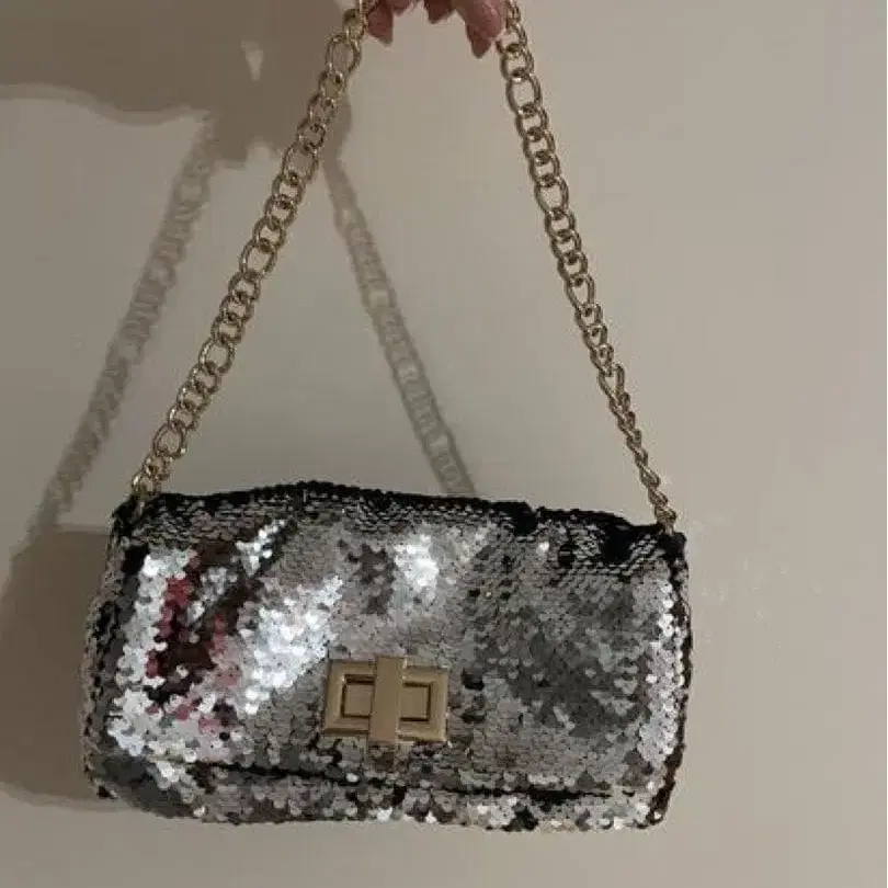 스팽글의 반짝임이 매력적인 파티 백. - 색상: 실버 - 소재: 스팽글 - 체인 길이: 숄더용 - 디자인: 플랫한 모양 - 장식: 골드 컬러 락 금장 장식 방문해 주셔서 감사합니다.
