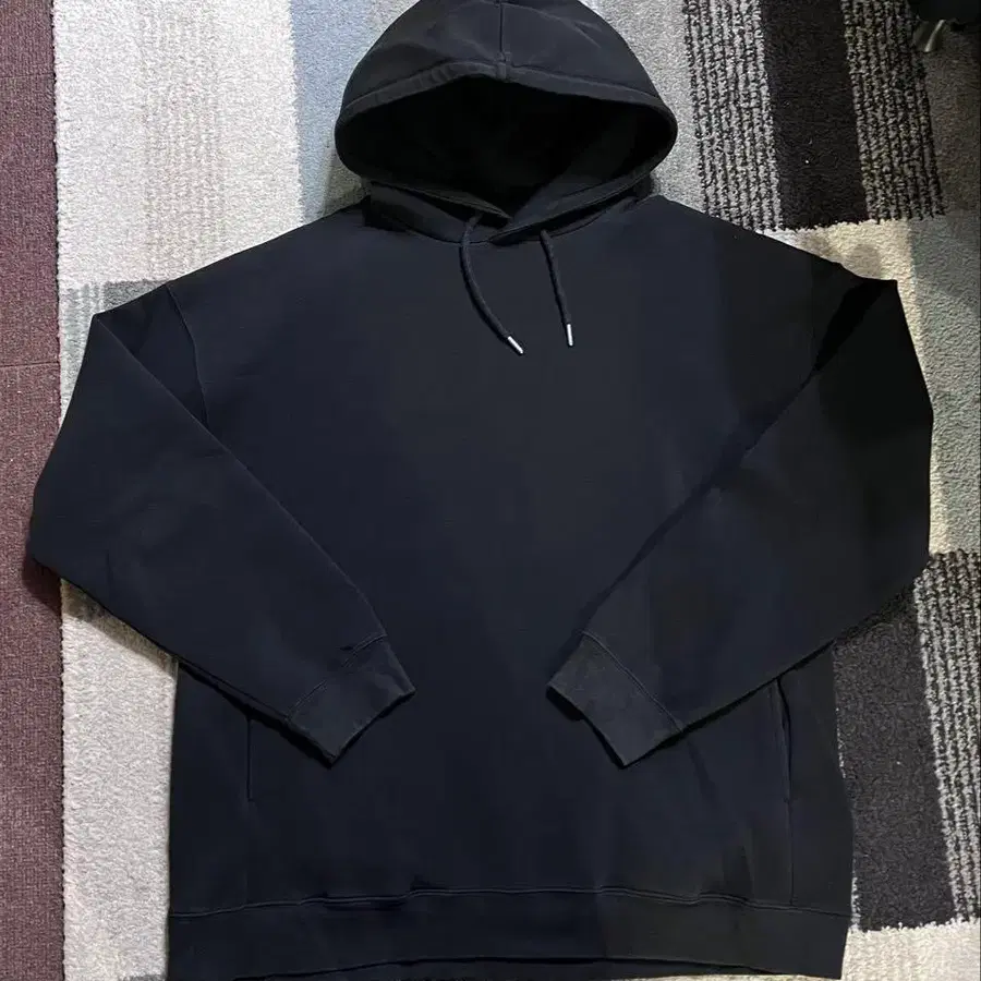 심플한 블랙 색상의 후드 부착 후드티, INHERIT 브랜드.