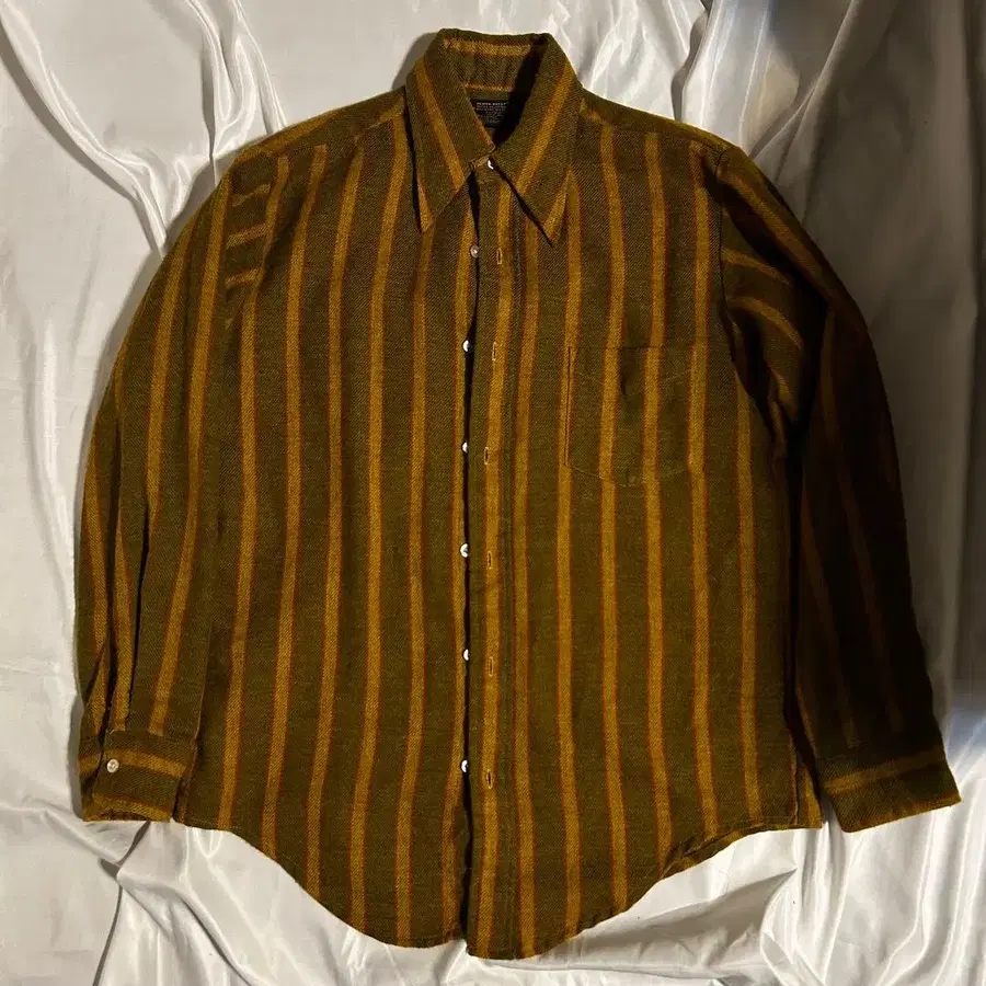 70년대 시어스 스트라이프 셔츠입니다. 두께감 있는 울 소재로 겨울에도 착용 가능합니다. 차분한 색감에 70년대 특유의 옷깃이 아주 귀엽습니다. 178cm 마른 체형으로 착용했습니다. 어깨 너비 46, 가슴 너비 60, 소매 길이 60.5, 기장 71