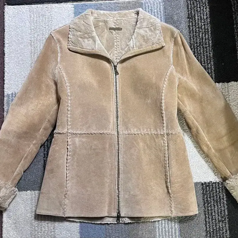 베이지 무스탕 코트, 지퍼가 있어 캐주얼 스타일에 최적입니다.