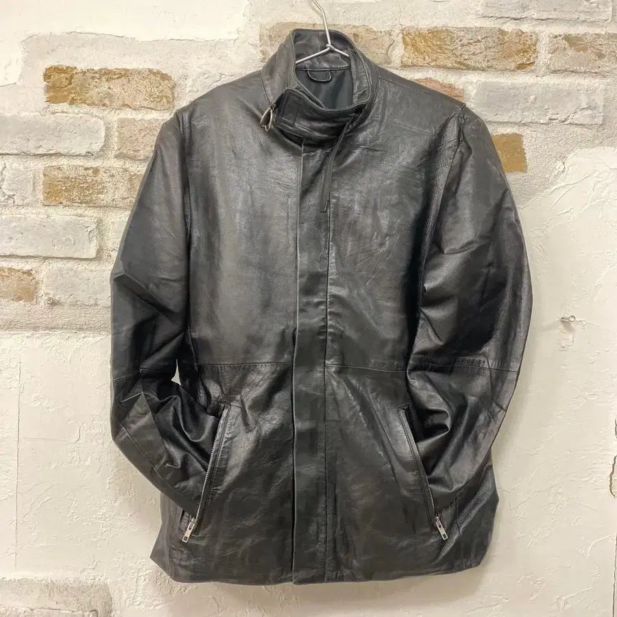 블랙 가죽 스탠드 카라 싱글 라이더 자켓, 사이드 포켓 포함.