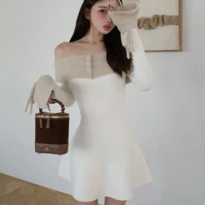 darich 다리치 후디 오프숄더 니트 미니 원피스 화이트
