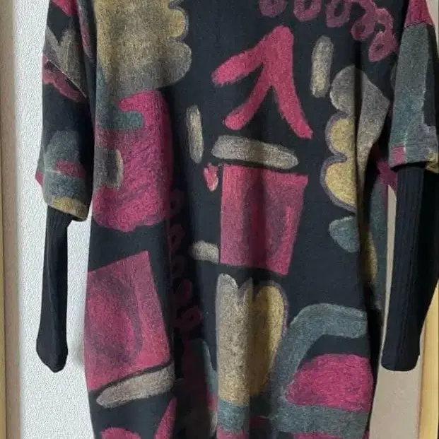 터틀넥 추상 무늬 튜닉, 리브 소매 포함. - 색상: 블랙, 빨간색, 노랑, 그린, 그레이의 추상 무늬 - 소재: 니트, 울 같은 질감 - 디자인: 터틀넥, 반팔 튜닉 - 특징: 소매 부분이 리브 디자인 방문해 주셔서 감사합니다. 사이즈 - M 여유로운 핏