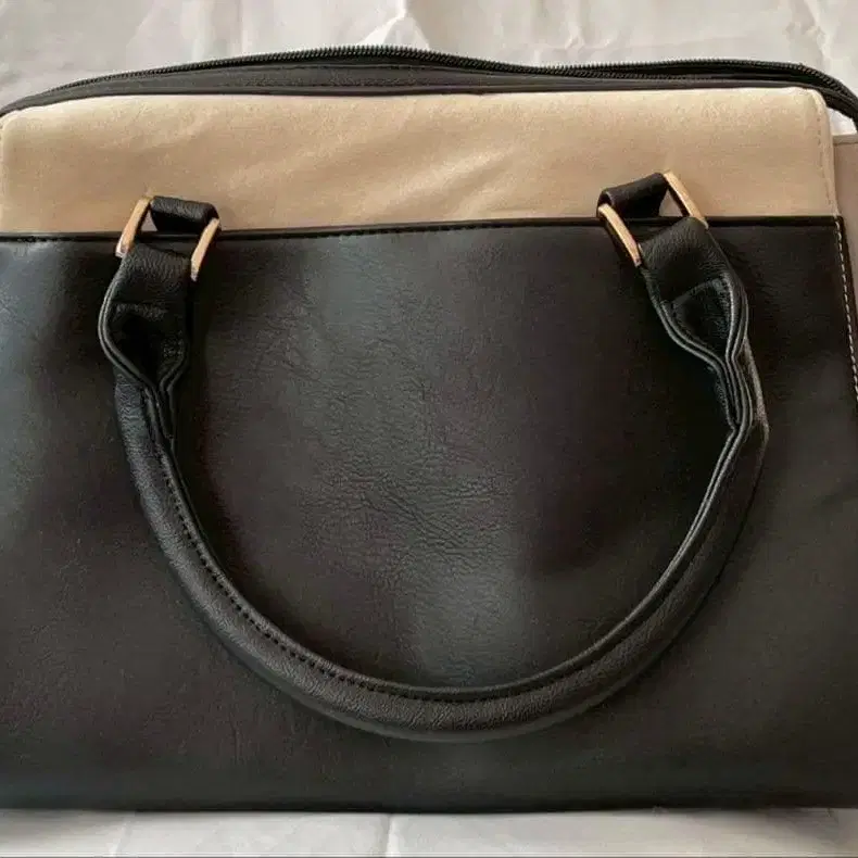 블랙과 베이지 색상의 합성 피혁과 벨벳 소재의 토트백, 탈부착 가능한 숄더 스트랩 포함.