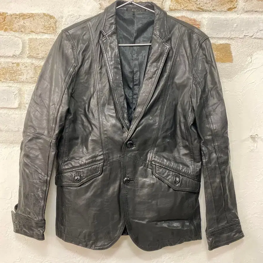 싱글 브레스티드 블랙 가죽 자켓, 전면 포켓 부착.