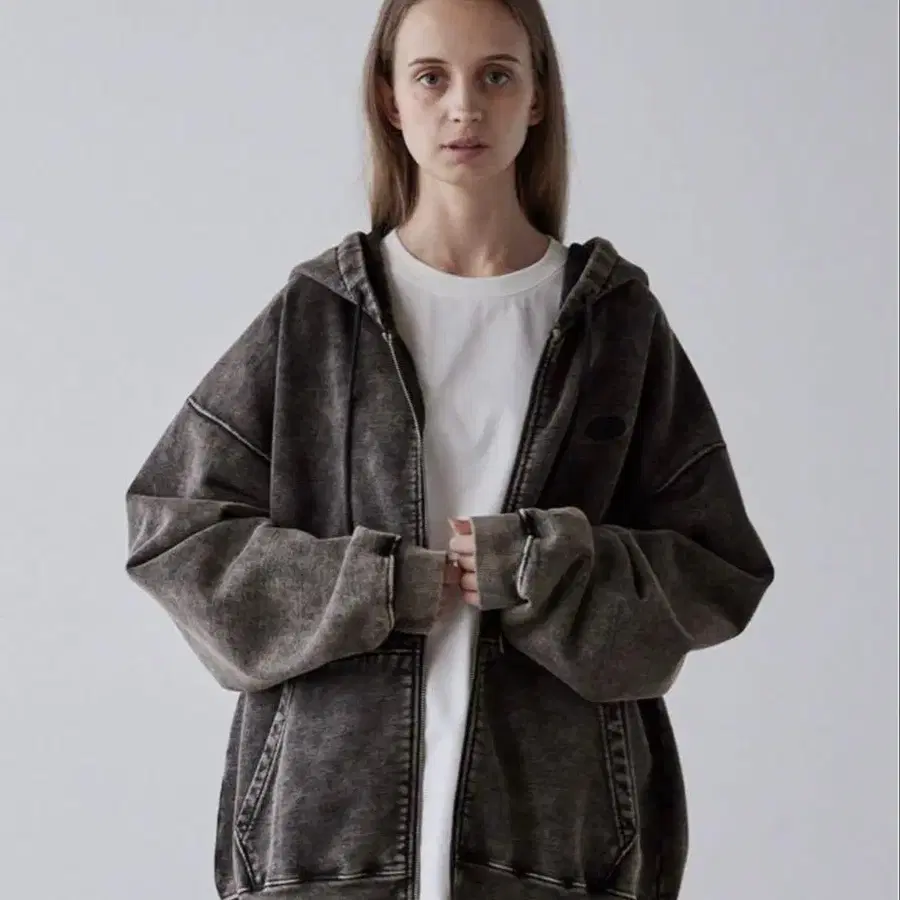 빈티지풍의 다크 그레이, 풀 집업 후드티.
