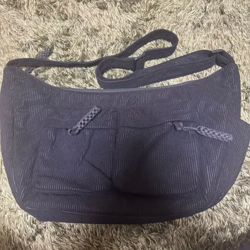다크 블루 색상의 코듀로이 숄더백입니다. 조정 가능한 스트랩과 지퍼 포켓이 있습니다. - Color: Dark black - Material: Corduroy - Features: Two front pockets with zippers - Strap Type: Adjustable shoulder strap 방문해 주셔서 감사합니다.