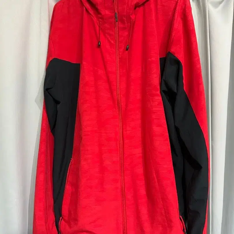 후드 부착 레드와 블랙의 자켓, 경량으로 움직이기 쉬운 디자인.