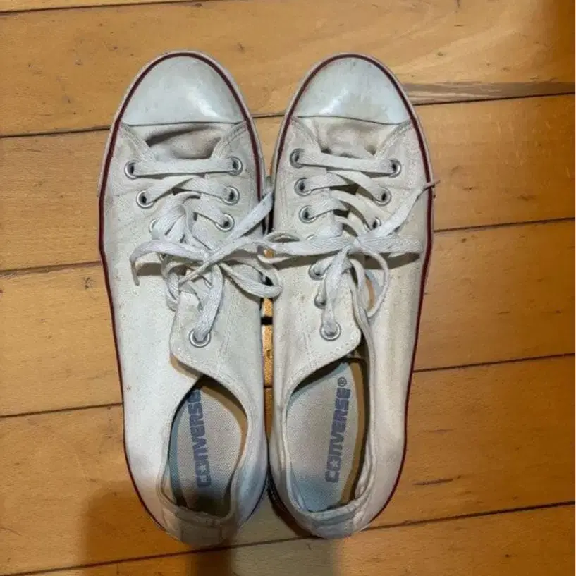 심플한 화이트 로우컷 스니커즈, 레드 스트라이프가 특징. - 브랜드: Converse - 모델명: All Star - 색상: 화이트 - 디자인: 로우컷 - 특징: 레드 스트라이프 - 상태: 사용감 있음 방문해 주셔서 감사합니다. 사이즈 - 27cm