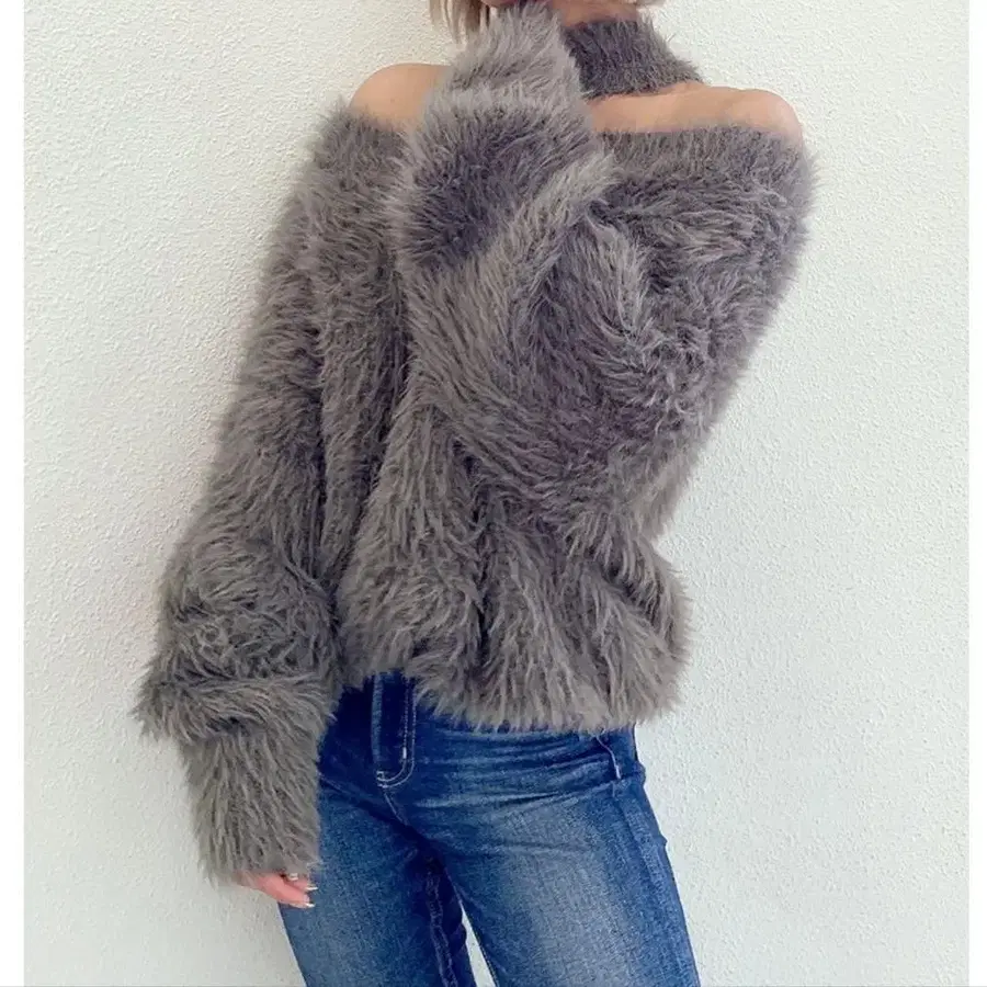 그레이 색상의 퍼(fur) 느낌 소재의 오프숄더입니다. 색상은 그레이입니다.
