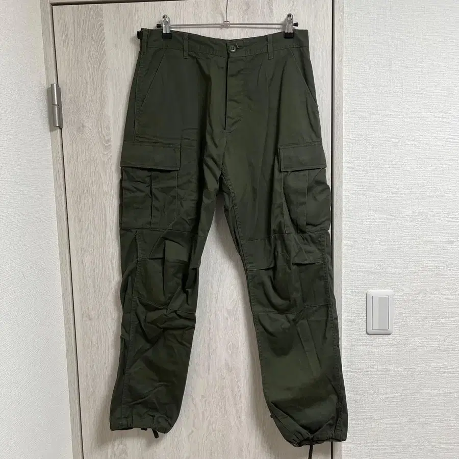 올리브 그린 카고 팬츠, 6개의 포켓으로 실용적입니다. 밑단을 조일 수 있는 디자인. - 사이즈: 허리 31인치, 인심 29인치 - 색상: 올리브 그린 - 스타일: 카고 팬츠 - 포켓 수: 6개 포켓 - 특징: 밑단을 조일 수 있는 디자인 방문해 주셔서 감사합니다. 사이즈 - L
