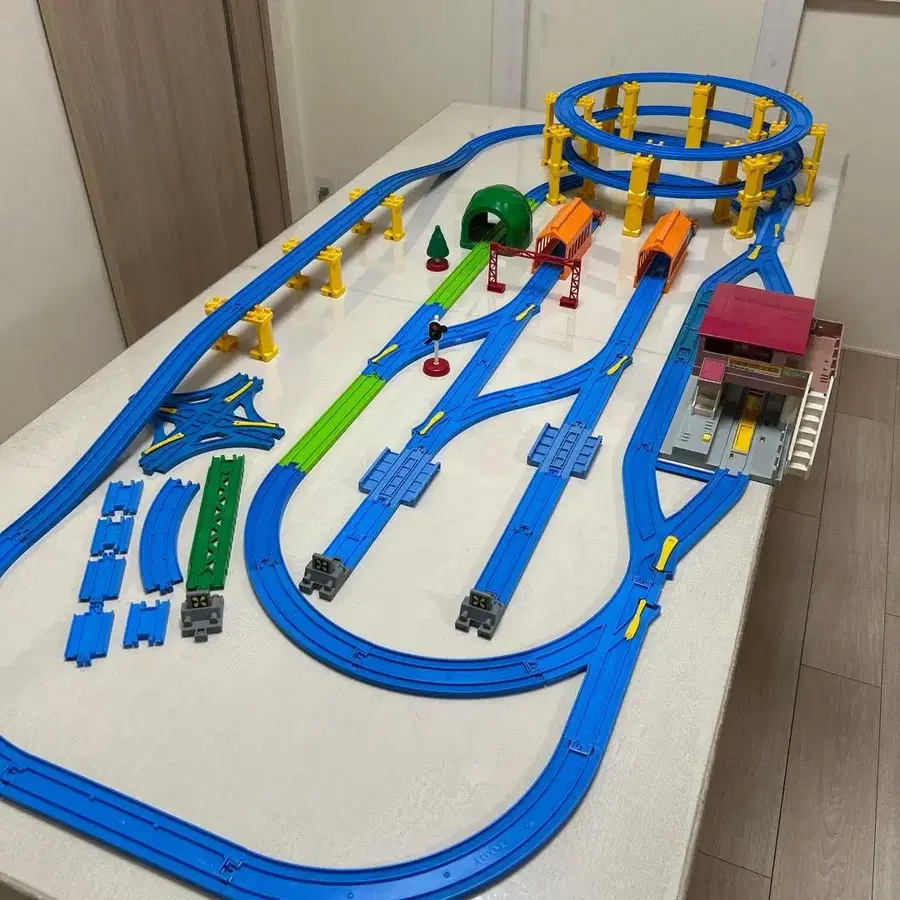 다양한 놀이를 할 수 있는 레이아웃 세트입니다. 이미지로 확인하고 싶으시겠지만 상태는 제 눈에는 깔끔한 편이라고 생각합니다 (각 부품 간단히 청소 완료). 차고 놀이나 프라레일 박람회와 같은 코스 레이아웃을 좋아하는 어린이에게 꼭!