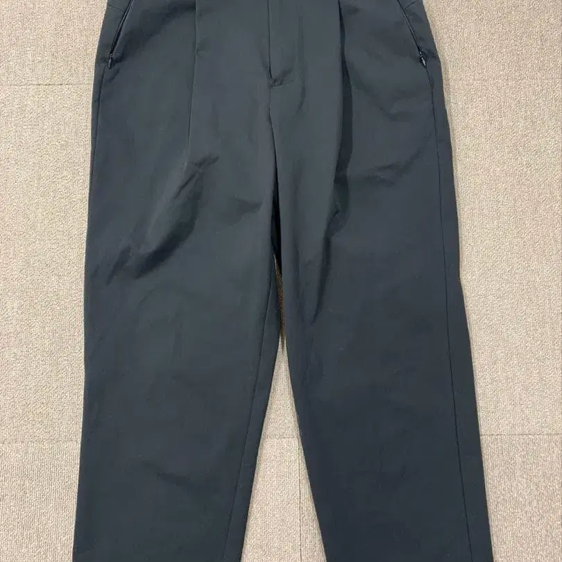 다크 그레이 와이드 테이퍼드 팬츠, 쾌적한 핏감이 특징.