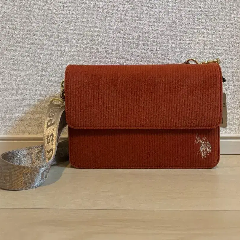 해당 상품은 폴로의 코듀로이 소재 오렌지 숄더백으로, 조절 가능한 스트랩이 있습니다.