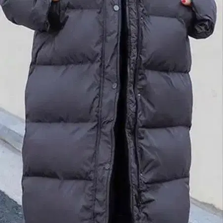 다크 그레이 색상의 후드 부착 롱 코트이며, 볼륨감 있는 실루엣이 특징입니다.