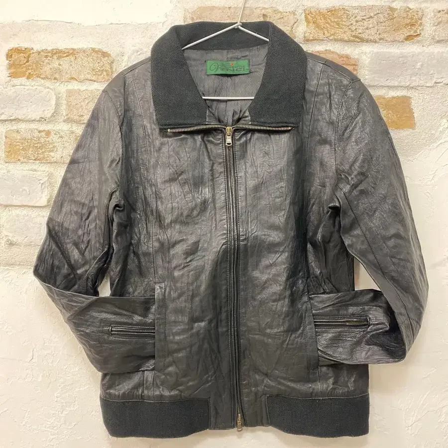 블랙 가죽 집업 자켓, 리브가 달린 소매와 사이드 포켓이 특징입니다.