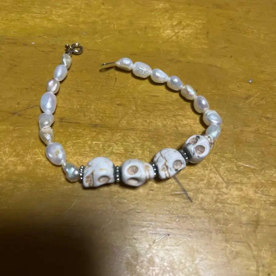 펄과 스컬 비즈의 유니크한 디자인의 팔찌. - 소재: 펄과 스컬 비즈 - 디자인: 스컬 모티브의 팔찌 - 스타일: 캐주얼, 유니크 - 색상: 화이트, 크림 - 잠금장치: 후크식 방문해 주셔서 감사합니다.