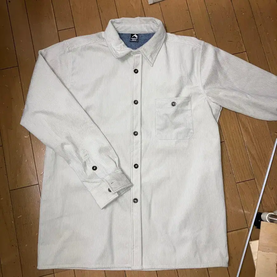 코튼 소재의 화이트 스트라이프 셔츠, L 사이즈, 가슴 포켓 부착.