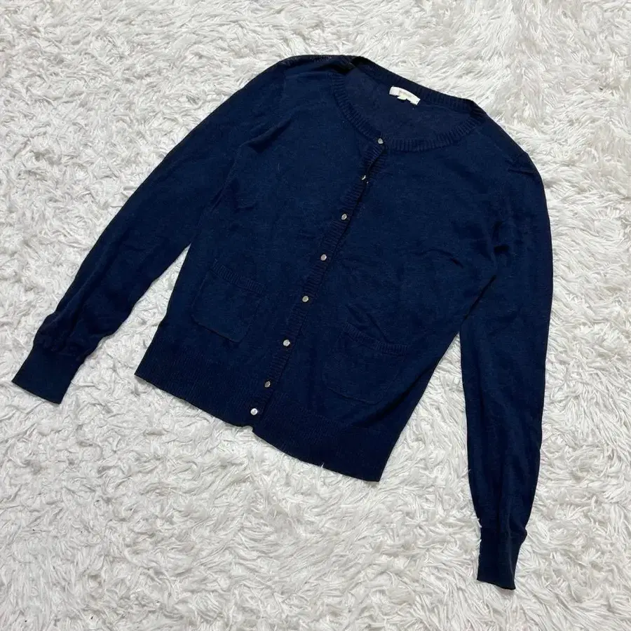 네이비 색상의 버튼이 달린 가디건, 앞면에 포켓 있음, 긴팔 디자인.