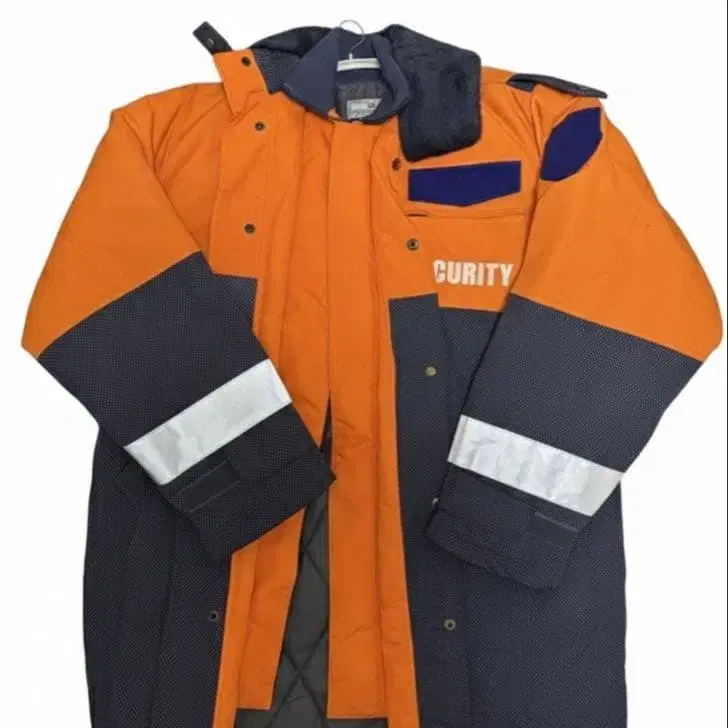 오렌지와 네이비 색상의 보안 방한 자켓, 반사재 부착으로 시인성 향상. - 색상: 오렌지와 네이비 - 디자인: 보안 로고 포함 - 특징: 반사재 부착 - 스타일: 방한 자켓 방문해 주셔서 감사합니다.