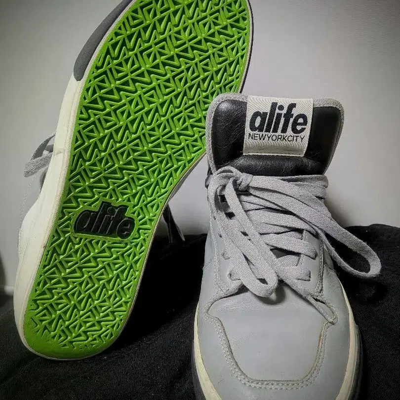 1999년 뉴욕에서 4명의 멤버로 설립된 브랜드 [ A LIFE ]의 그레이 하이컷 스니커즈입니다. 밑창은 그린으로 참신한 아이템입니다. 부속 끈 포함이지만 미사용입니다.