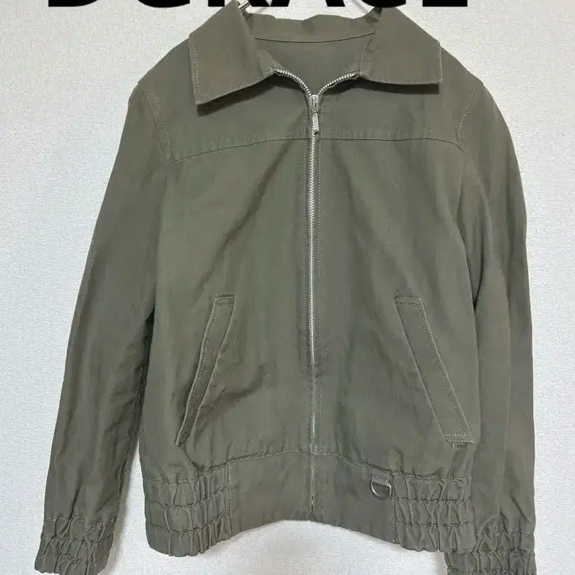 집업 디자인의 올리브 색상 자켓, 허리 부분에 밴딩으로 핏감을 조정 가능.