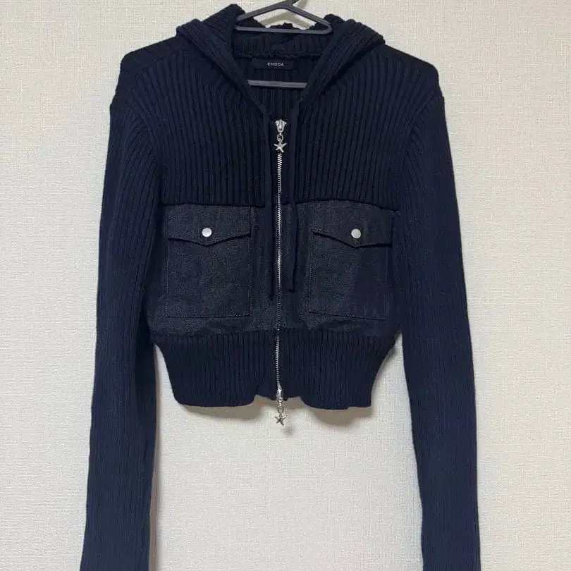 네이비 크롭 후드티, 후드와 지퍼 부착, 포켓 부착. 사이즈 F 착용 횟수 2회 - 브랜드: EMODA - 색상: 네이비 - 디자인: 크롭 기장, 후드 부착, 지퍼 부착, 포켓 부착