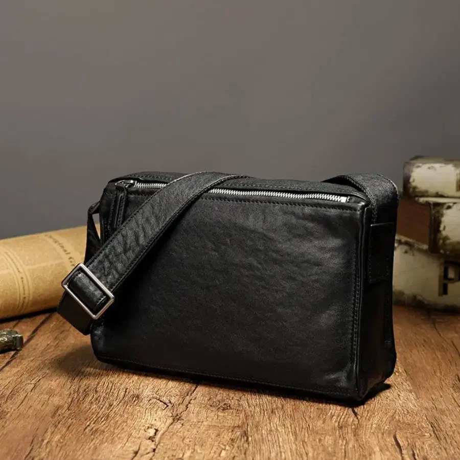 자동 번역되었어요. 원문보기블랙 가죽 지퍼 숄더백, 조정 가능한 스트랩이 특징입니다.