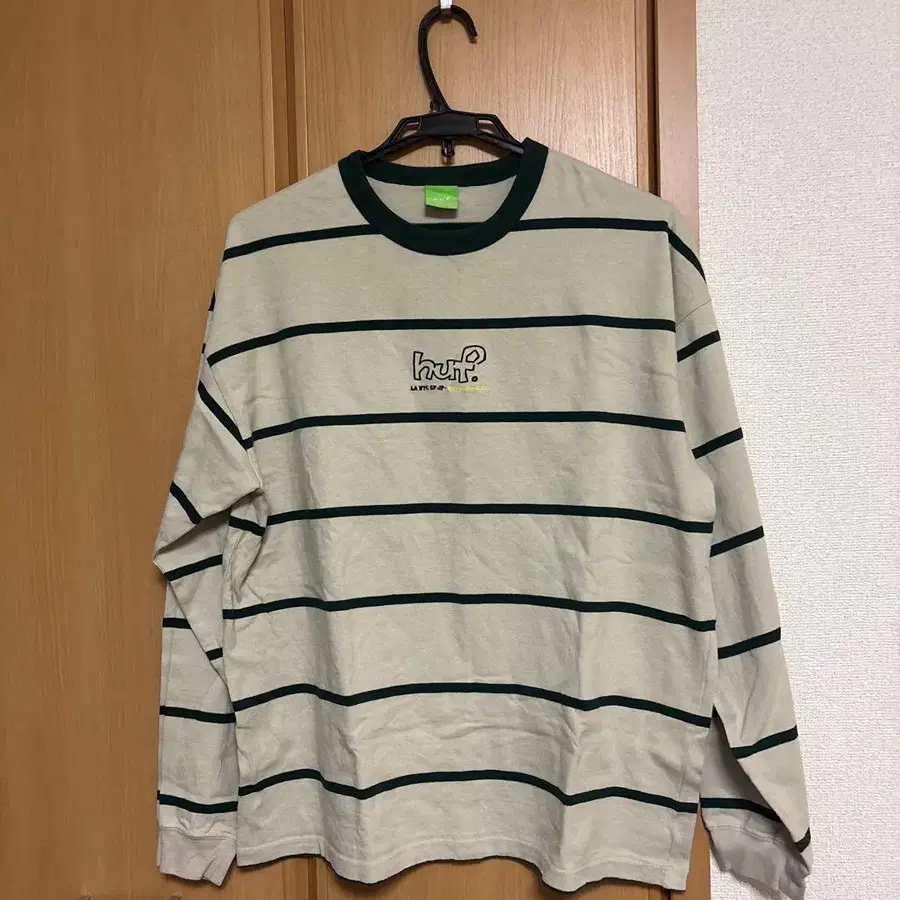 아이보리와 그린 색상의 스트라이프 디자인 긴팔 T셔츠. - 브랜드: HUF - 색상: 아이보리/그린 - 디자인: 스트라이프 - 스타일: 긴팔 - 특징: 로고 자수 방문해 주셔서 감사합니다. 사이즈가 맞지 않아 몇 번 착용하지 않았습니다. 컴팩트하게 포장하여 보내드리겠습니다. 양해 부탁드립니다.