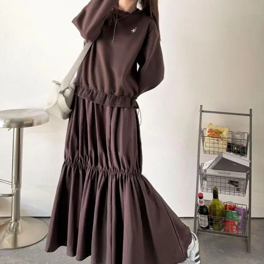 다크 브라운 색상의 긴팔 티셔츠 원피스, 허리 조절 가능하며 프릴 디자인.