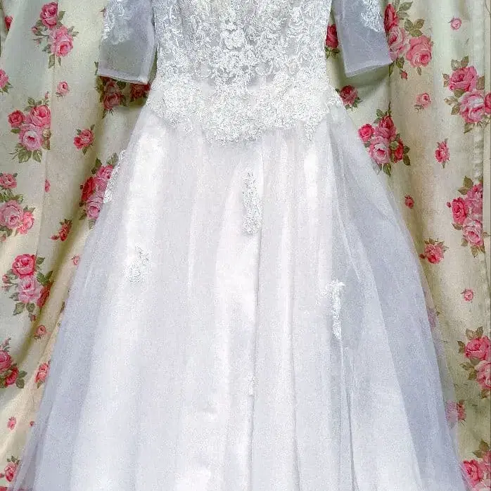 저는 다른 드레스를 입었습니다. 누군가에게 양도합니다(*^^*) 레이스와 꽃무늬 자수가 놓인 화이트 웨딩 드레스. 롱 드레스 - 색상: 화이트 - 디자인: 레이스 장식 포함 - 소매 스타일: 긴팔 - 스커트 스타일: 플레어 - 소재: 튤 - 자수 디테일: 꽃무늬 자수 방문해 주셔서 감사합니다.