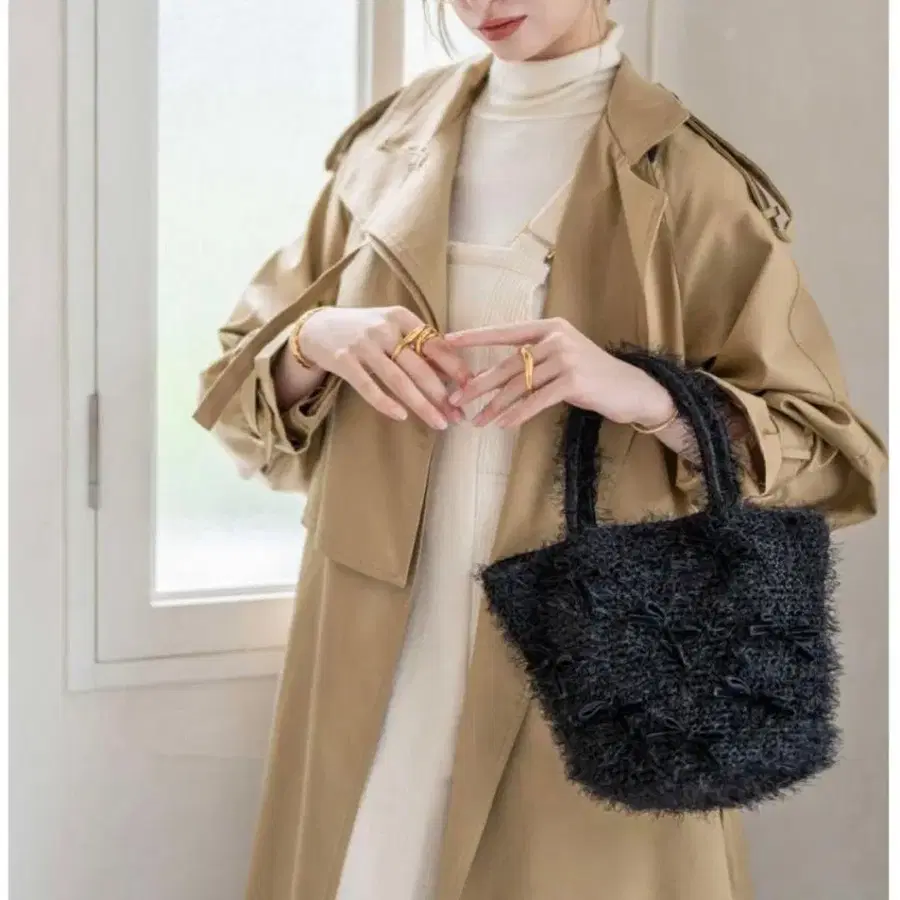 [헤이니] 샤기 리본 퍼 핸드백 블랙