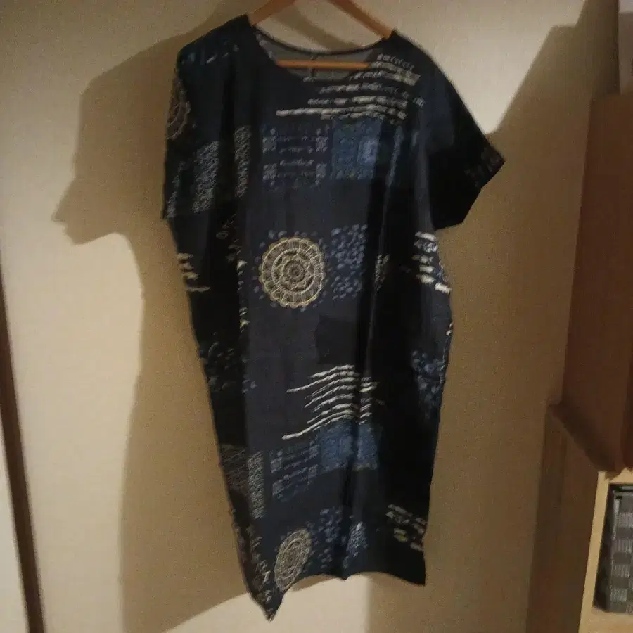 기하학 패턴이 특징인 네이비 색상의 반팔 원피스. - 색상: 네이비 - 디자인: 기하학 패턴 - 소매 스타일: 반팔 - 소재: 코튼 방문해 주셔서 감사합니다.