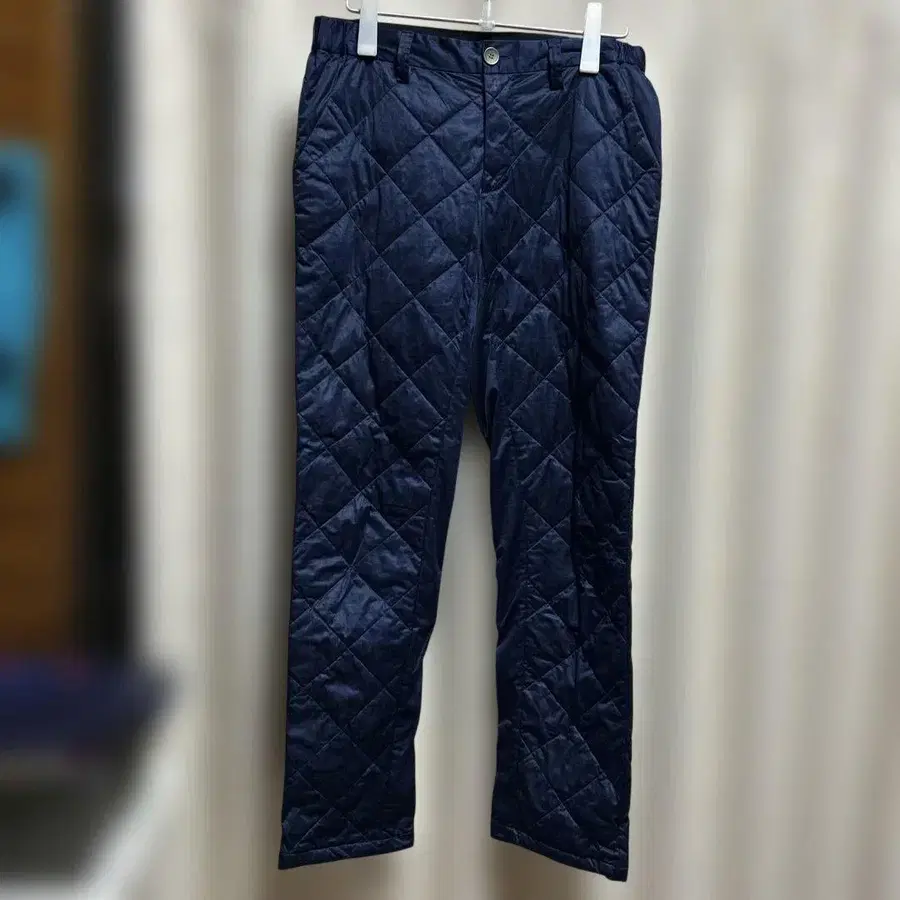 퀼팅 소재의 네이비 팬츠, 스트레이트 레그 스타일. - Color: Navy Blue - Material: Quilted Fabric - Style: Straight Leg 평평하게 놓았을 때 사이즈 허리 42 인심 80 퀼팅 웜 팬츠입니다. 밑단은 스핀들로 조절 가능합니다. 따뜻하고 가벼워서 지금 시기에 딱 좋습니다. 허리는 밴딩으로 늘어납니다. 착용은 3~4회로 깨끗한 편입니다. 방문해 주셔서 감사합니다.