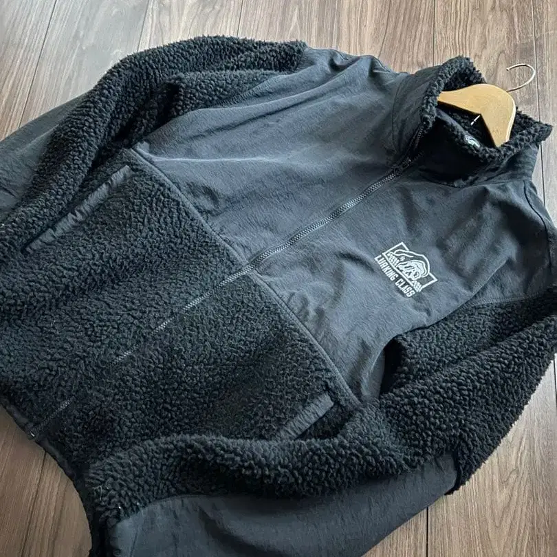 보아 플리스 소재의 블랙 자켓, LURKING CLASS 로고 포함.