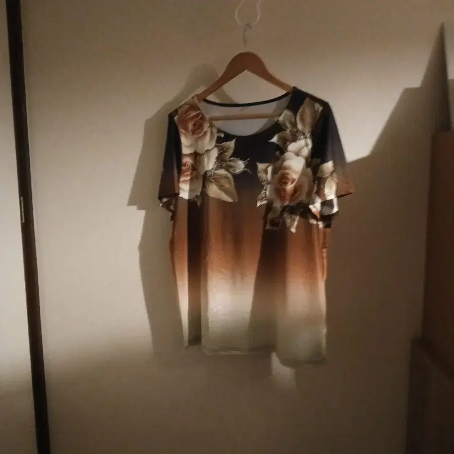 그라데이션과 꽃무늬가 특징인 반팔 T셔츠. - 색상: 그라데이션 (브라운에서 블랙) - 디자인: 꽃무늬 - 넥라인: 라운드넥 - 소매: 반팔 방문해 주셔서 감사합니다.