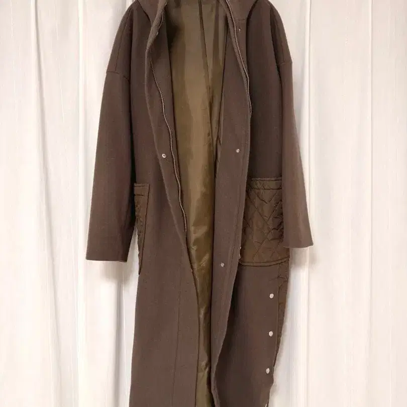 후드 부착 브라운 롱 코트, 퀼팅 포켓과 스냅 버튼이 부착되어 보온성과 스타일을 겸비했습니다.