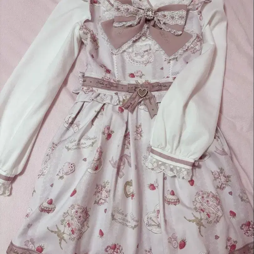LIZLISA Salon de Fraise 패턴 원피스 입니다. 공식 온라인 스토어에서 구매하여 2회 정도 착용했습니다. 약간의 사용감은 있지만, 눈에 띄는 얼룩은 없습니다. 즉시 구매 가능