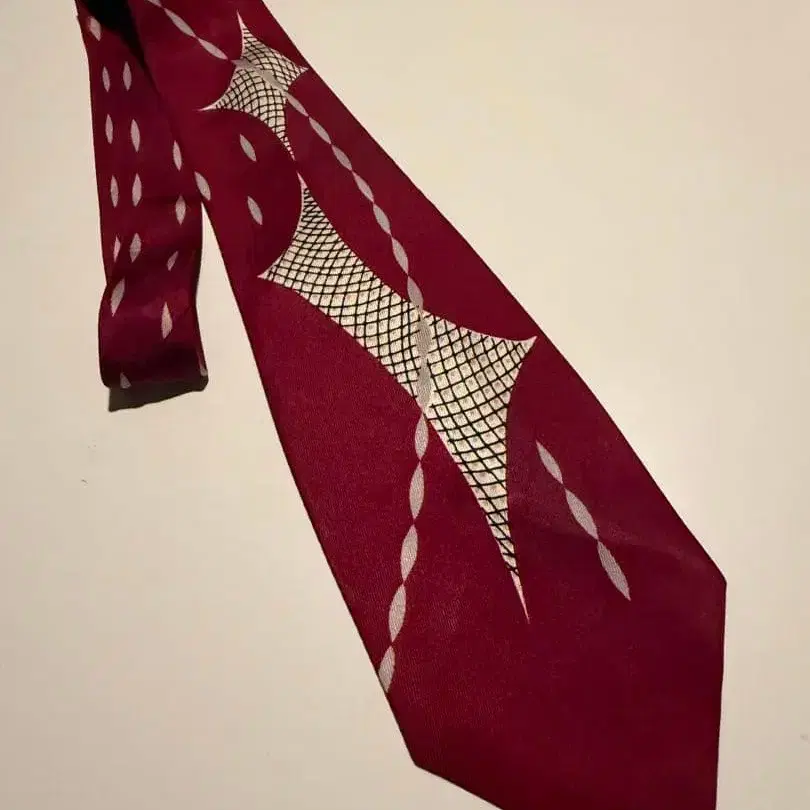 빈티지 40s 50s 와인 레드 기하학 패턴 실크 넥타이