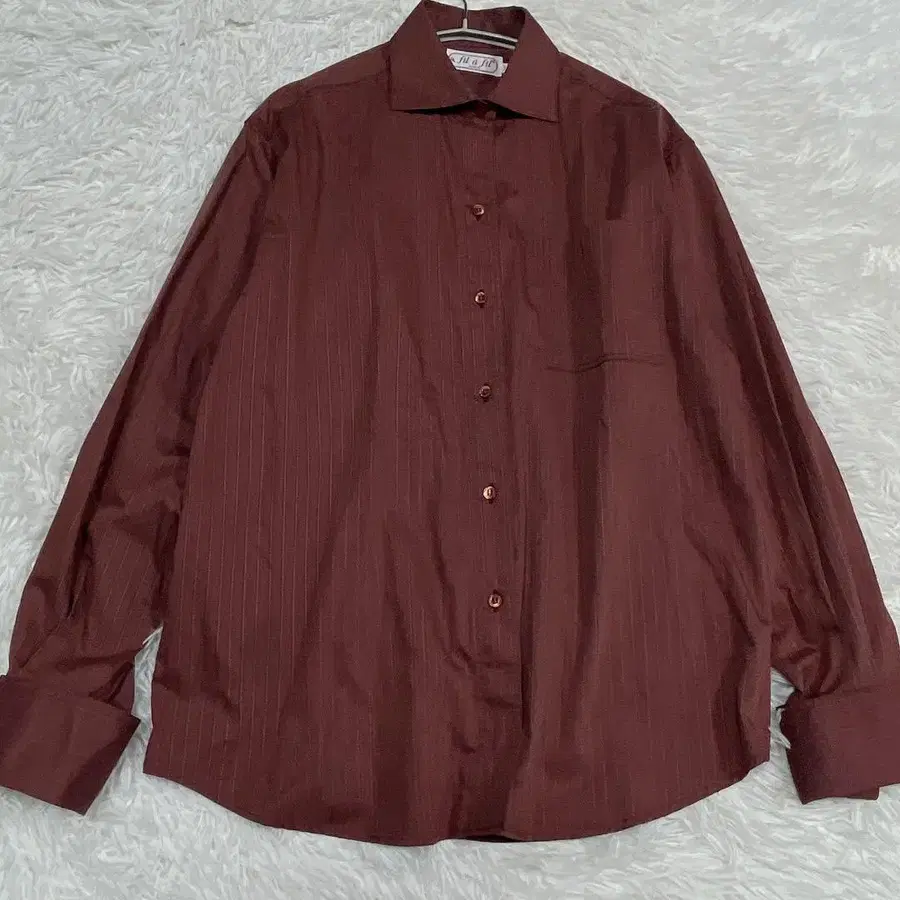 버건디 스트라이프 디자인에 가슴 포켓이 달린 커프스용 긴팔 셔츠.