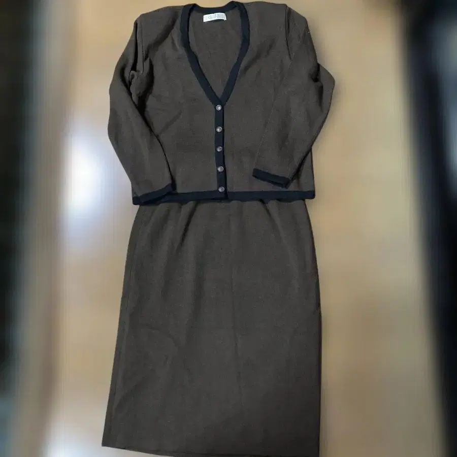 브라운 니트 소재로 된 V넥 긴팔 가디건과 스커트 셋업. 자택 보관. - 색상: 브라운 - 디자인: 버튼이 달린 가디건과 스커트 세트 - 소재: 니트 - 소매: 긴팔 - 넥라인: V넥 - 트리밍: 네이비 트리밍 방문해 주셔서 감사합니다.