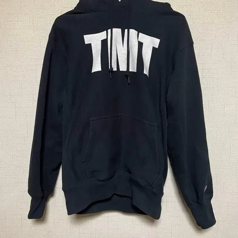프론트에 큰 TMT 로고가 특징인 블랙 후드티.