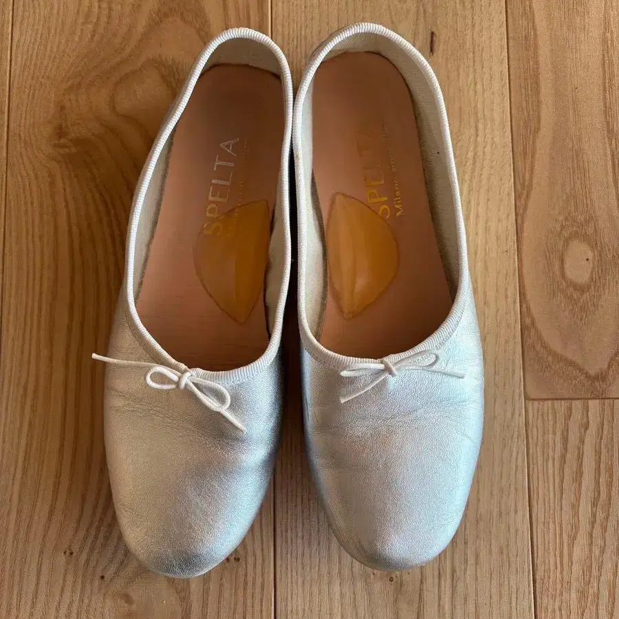 실버 색상의 리본 포함 발레 슈즈, 플랫 밑창으로 쾌적한 착용감. 37 사이즈입니다. 밑창 보강(裏張り) 되어 있습니다. 안쪽 발바닥 중앙 부근에 투명한 씰이 붙어 있습니다. 흠집 등은 사진과 같습니다. - 브랜드: SPLETA - 색상: 실버 - 스타일: 발레 슈즈 - 디자인: 리본 포함 - 밑창: 플랫 방문해 주셔서 감사합니다.