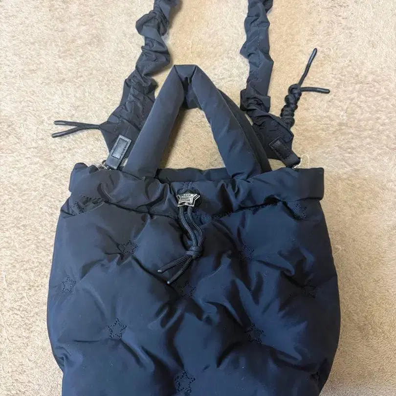 프릴이 달린 스트랩과 별 모양 참이 특징인 통통한 블랙 나일론 숄더백. - 색상: 블랙 - 내부 포켓: 지퍼 포켓 있음 - 스트랩: 프릴 스트랩 - 디자인: 별 모양 참 한 번 짧게 사용했습니다.